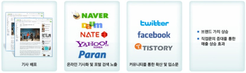 1. 인터넷 이용자의 54%가 온라인 미디어를 이용, 그중 77.3%가 인터넷 신문 및 뉴스를 이용2. 고객인 기업의 이슈를 뉴스 정보 형태를 접근하게 되어 높은 인지도 및 신뢰도 확보3. 신문기사는 블로그 등의 1인 미디어와 카페 등 커뮤니티로 확산 및 재생산